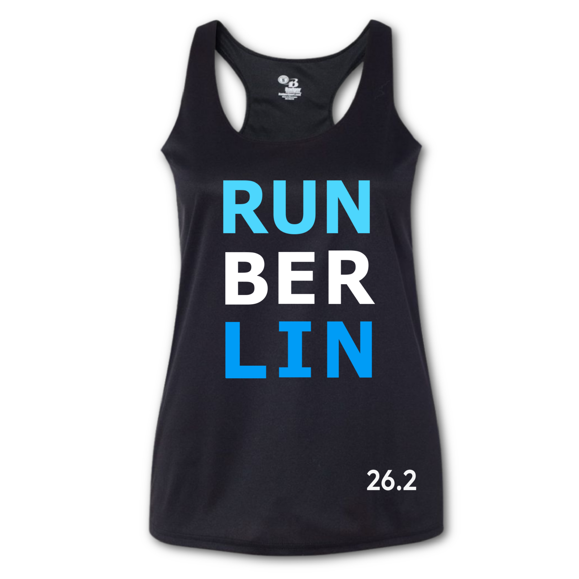 This tank boldy displays RUN BER LIN in hughes of Aqua, White and Horizon Blue on a solid black performance fabric and 26.2 on the bottom left hem.